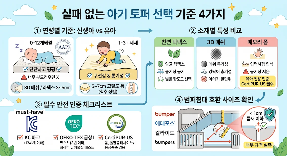아기 토퍼는 성인용과 달리 '안전'이 최우선입니다. 다음 4가지 기준을 순서대로 체크하세요.